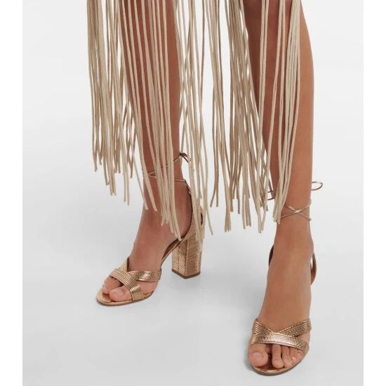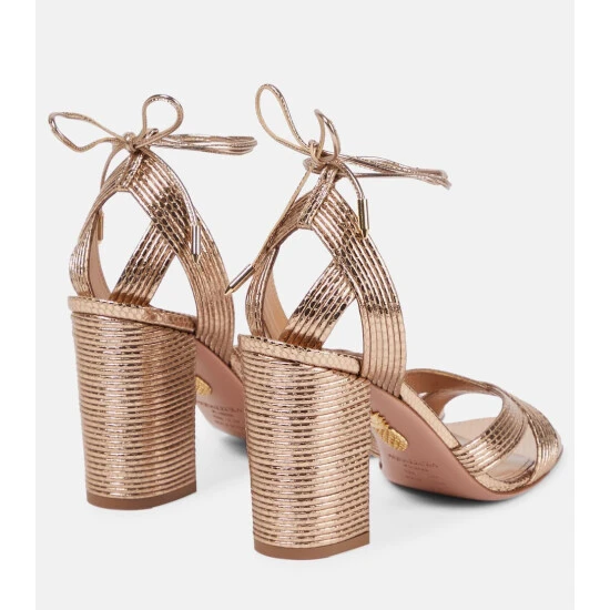 Aquazzura’s Ari sandals bring statement impact to cocktail hour styling. They’re made from gold, lambskin leather with 85mm block heels, and have slender rope ties that will wrap elegantly around the ankles.
