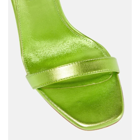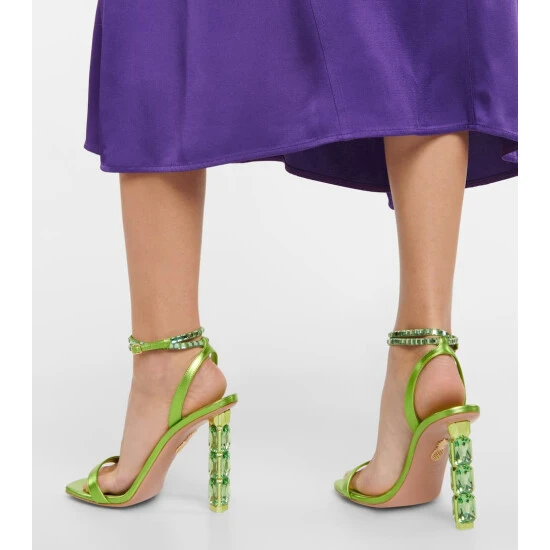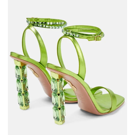 Embrace color with the dazzling Aura 105 sandals from Aquazzura. Made from lustrous lime green metallic leather, the style features a sparkly stacked crystal heel with thin embellished ankle straps.