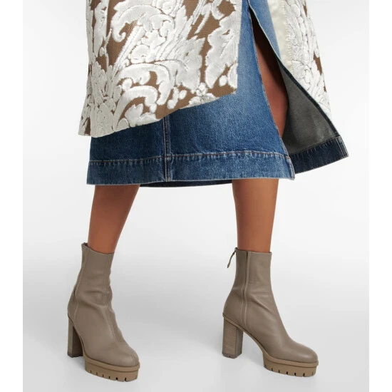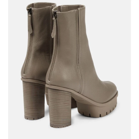 Inspired by styles from the ’70s, the Francoise ankle boots from Aquazzura are crafted from gray leather and set on platform soles.