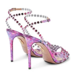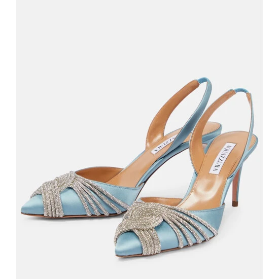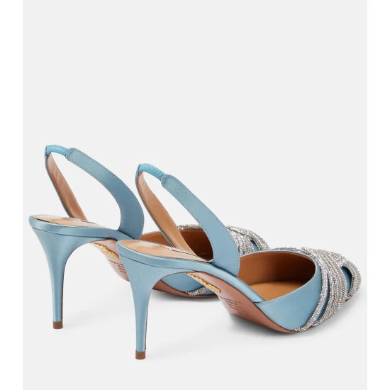 Adorned with crystal-embellished twisted hardware, Aquazzura’s Gatsby Sling 75 pumps are primed for late nights. They’re made from lustrous powder-blue satin and feature sling back straps and stiletto heels.