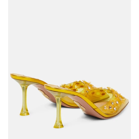 Aquazzura reaches new heights in luxury footwear with the Meteorite mules. Set atop 75mm heels, they feature sun-yellow PVC uppers that are shaped to elegant, pointed-toed profiles, and adorned with an explosion of gem-embellished appliqués.