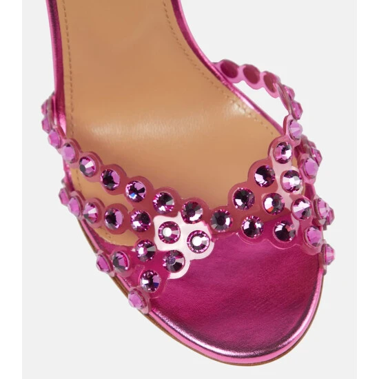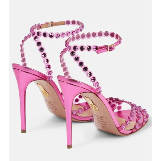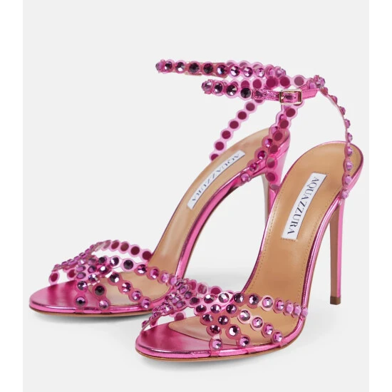 Party-going feet will love to dance around in Aquazzura’s Tequila sandals. They’re propped on 105mm metallic-leather stiletto heels and feature clear scalloped PVC straps that are studded with crystals all over.