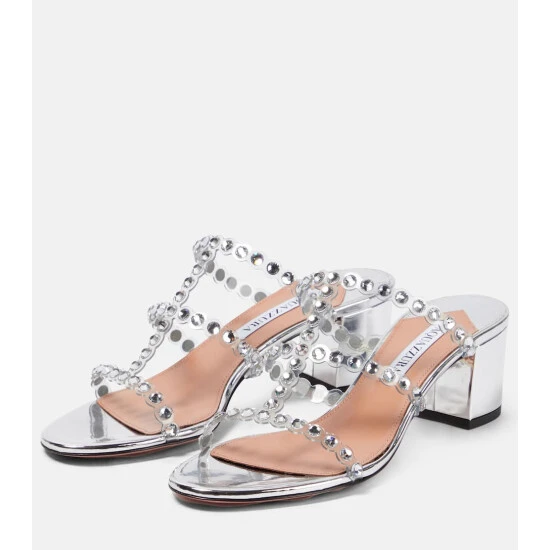 Dazzle after dark in the Tequila Plexi sandals from Aquazzura. Crafted in Italy from silver-tone leather and PVC, the strappy design is covered in crystal embellishments and sits on a block-heel.