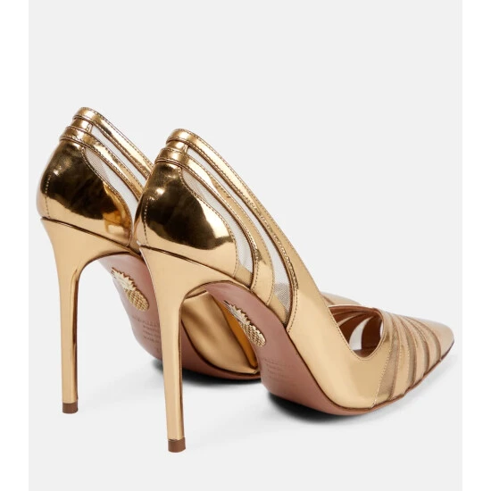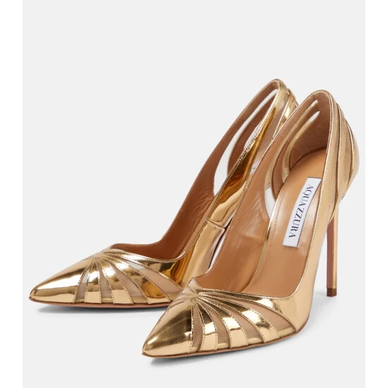 Aquazzura’s The Spy pumps are crafted from metallic leather with slim cutouts covered with shimmering mesh. Set on 105mm stiletto heels, this gold pair will add light to your evening outfits.